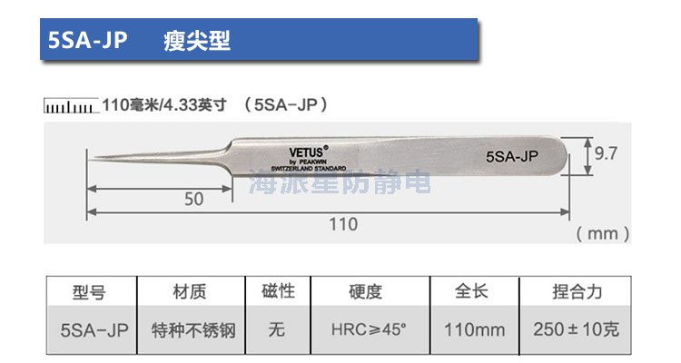 VETUS/維特斯品牌鑷子,產(chǎn)品系列有:電子鑷子系列、JP系列、SA系列、ST系列、ESD防靜電系列、SED可換頭防靜電系列、MCS美容鑷子系列共100多個品種,產(chǎn)品具有超精細(xì)、高精密、抗磁、抗酸、超硬又有彈性、超耐用等特點。產(chǎn)品銷往三十多個國家和地區(qū),成為全球很有知名度的國際品牌產(chǎn)品。